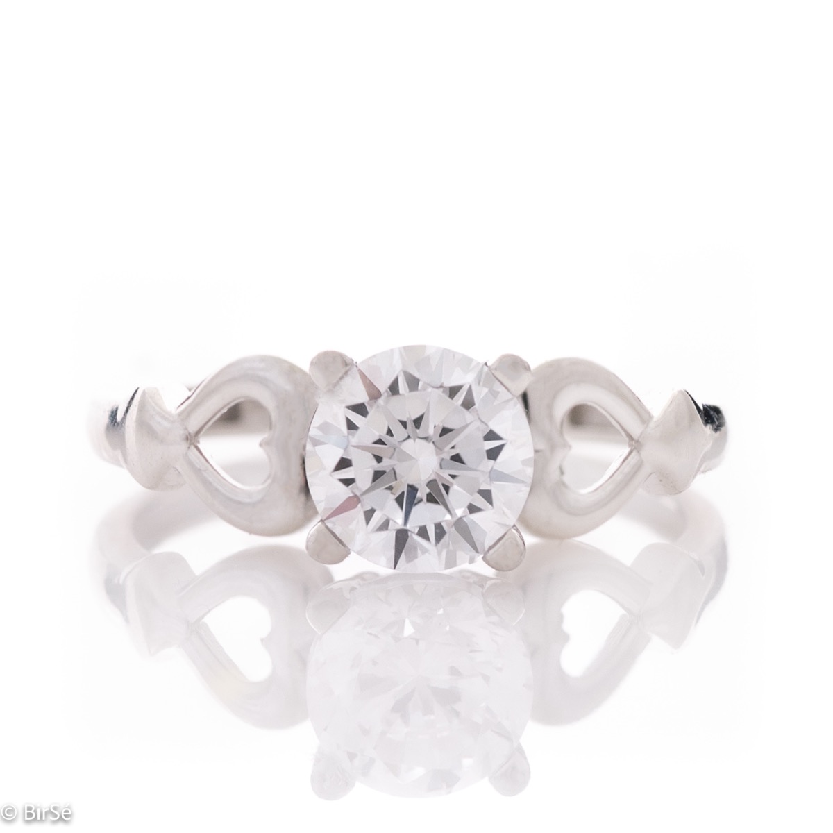 Изключителен годежен пръстен с изящен дизайн и нежна изработка изцяло от елегантно бяло злато в съчетание с централен планински кристал и две красиви сърчица.