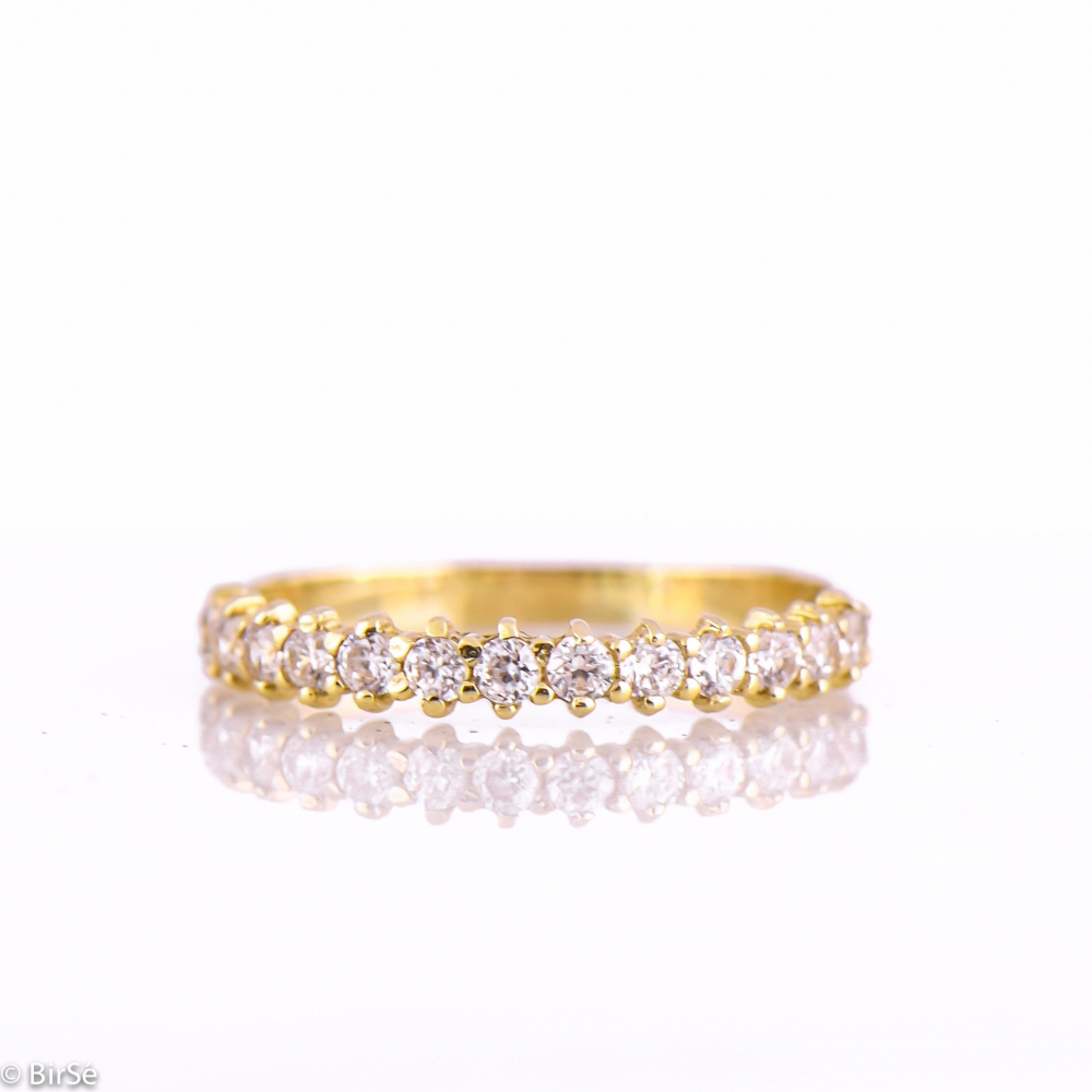 Невероятно нежен и елегантен дамски пръстен, оформен като кралска тиара с ред, редуващи се камъни циркони. Стилно съчетание на цирконите с фино класическо жълто злато.