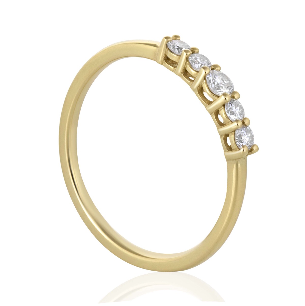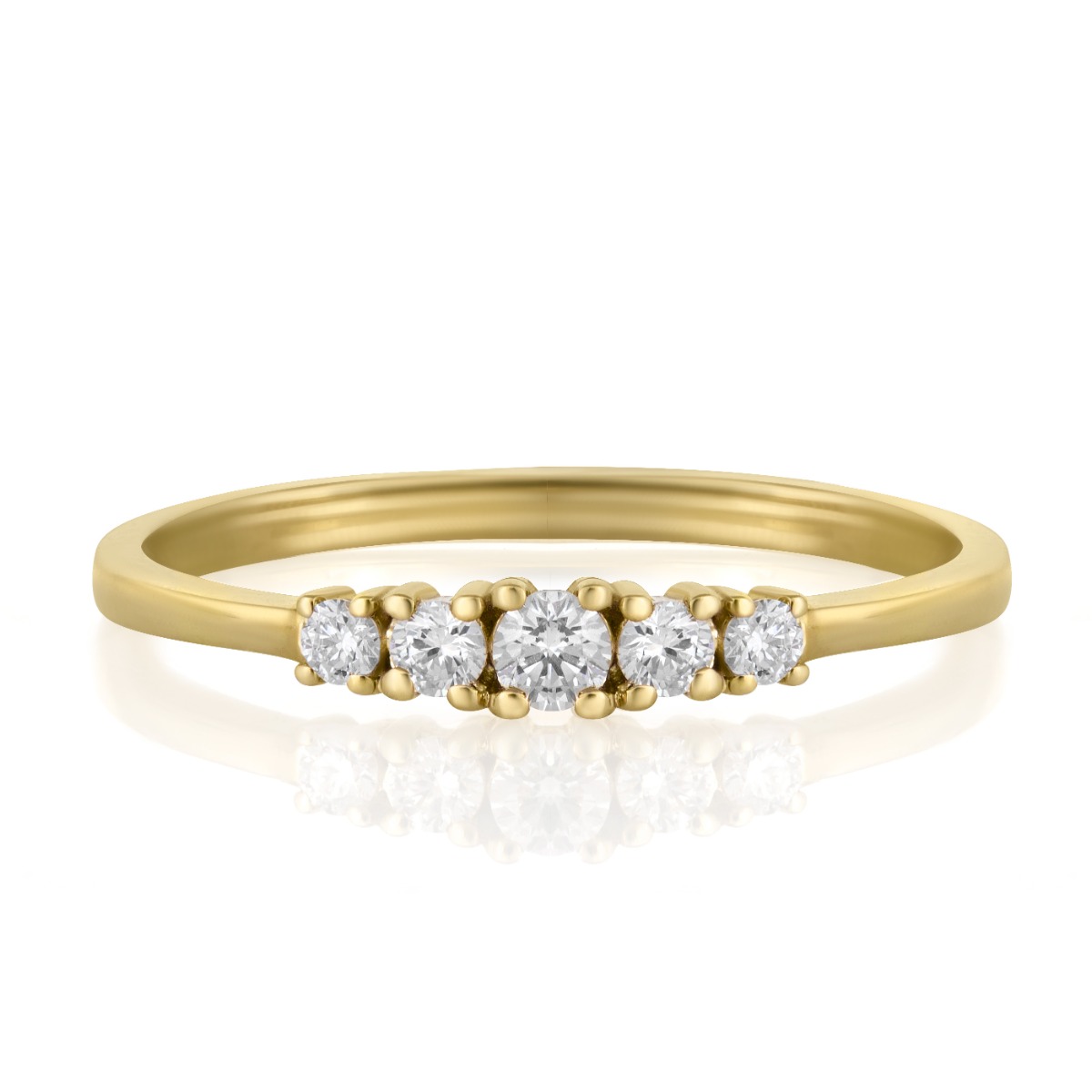 Елегантен и хармоничен пръстен, в който пет естествени диаманта с общо тегло 0,22 ct са подредени в изящна линия, създавайки впечатляващ блясък и усещане за баланс. Централният диамант е леко акцентиран, а страничните камъни плавно допълват композицията, придавайки изискан завършек на дизайна.