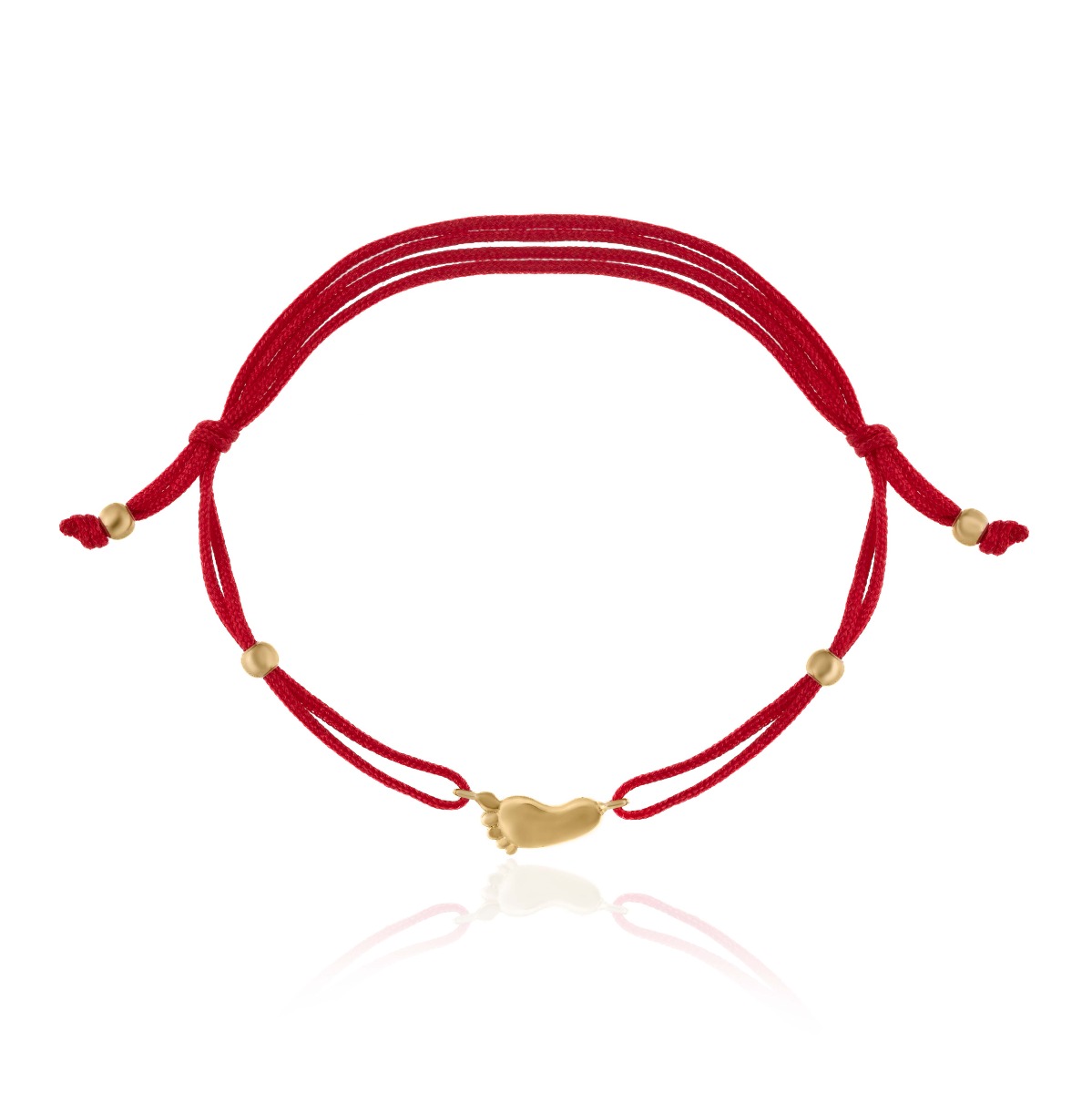 Олекотена златна гривна червен конец против уроки, с изчистен елемент на бебешко краче и добавени топчета злато по конеца. Гривната е подходяща и за малки бебета и деца, поради регулируемият си размер.
