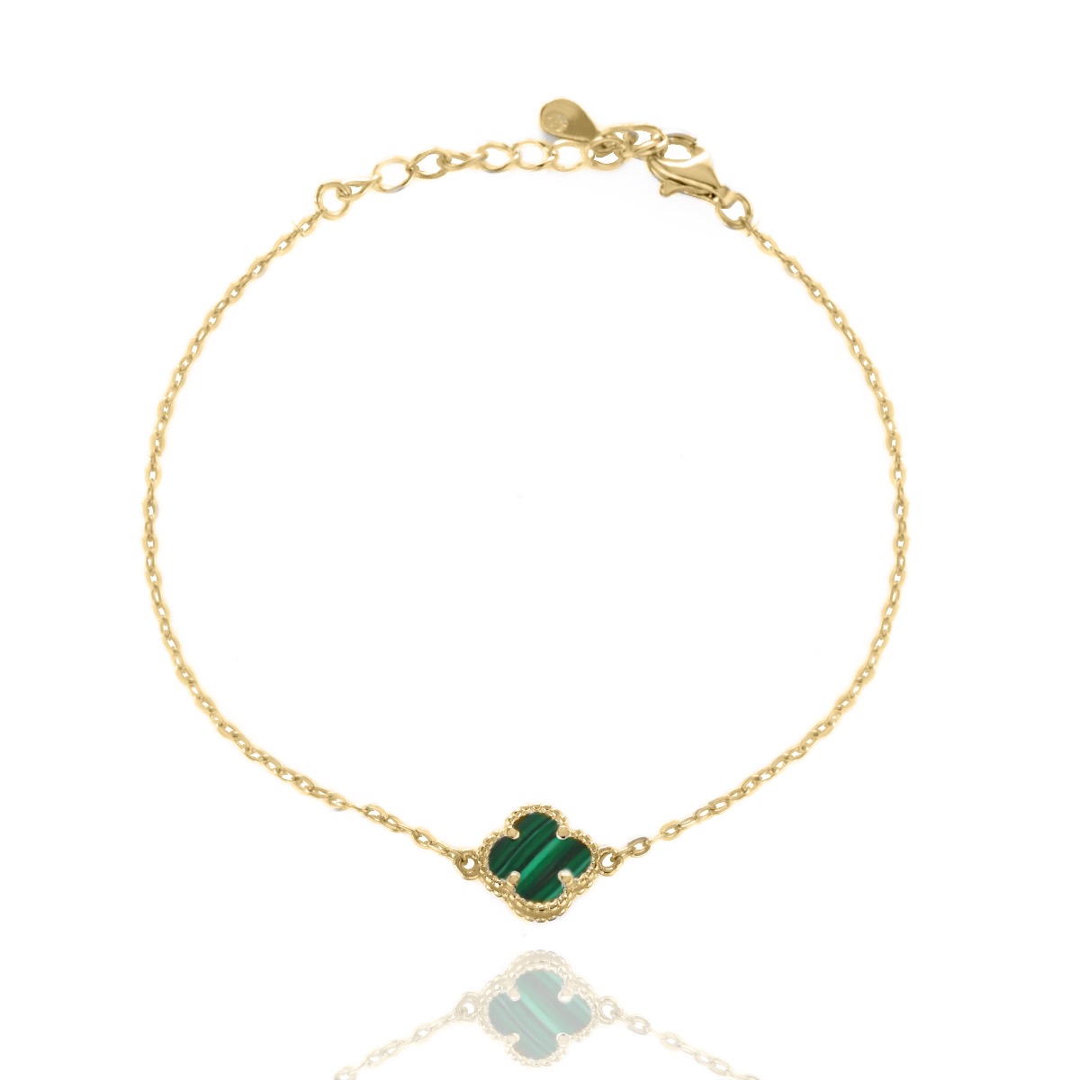 Изящна дамска гривна с мека изработка и регулируем размер, съчетаваща класическо жълто злато с нежните детайли на детелинка. Мистичен малахит е в средата на изящен обков с форма на цвете и му придава магнетично очарование. Възможна комбинация с колие в същия стил.