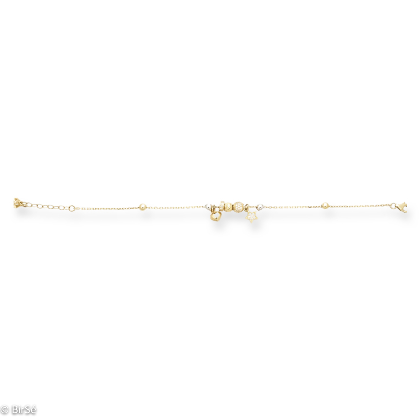 Изящна дамска гривна с очарователен и ефектен дизайн, съчетаващ различни по форма висулки с бляскави цирконни и прецизна изработка изцяло от жълто злато.