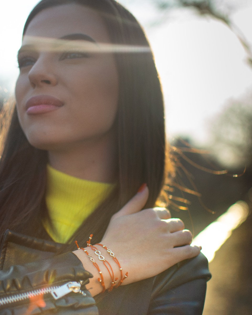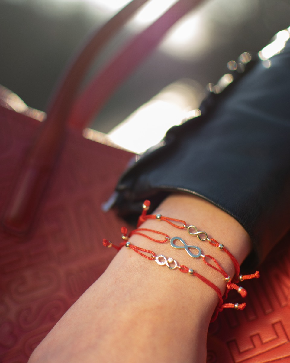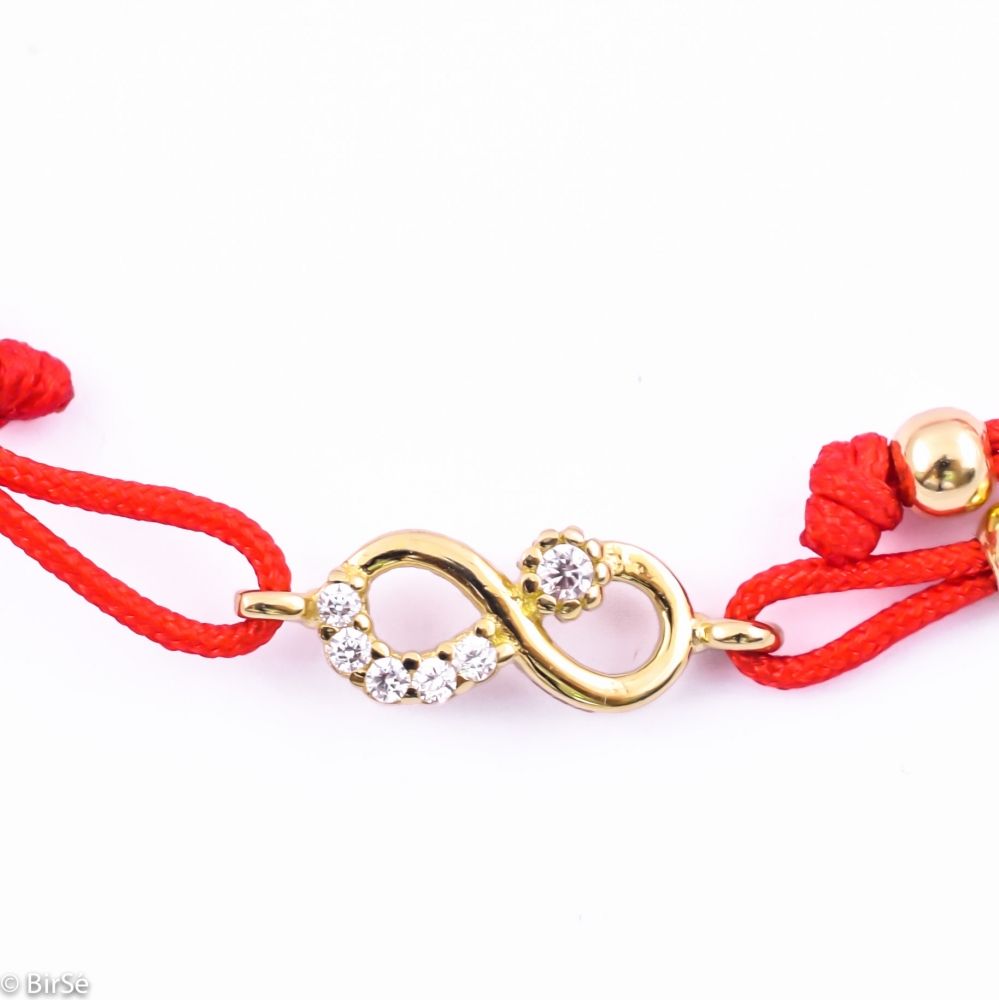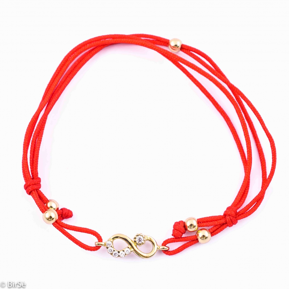 Нежно-елегантна дамска гривна с червен конец и фино-изработен знак за безкрайност, оформен изцяло от класическо жълто злато и ръчно монтирани циркони.