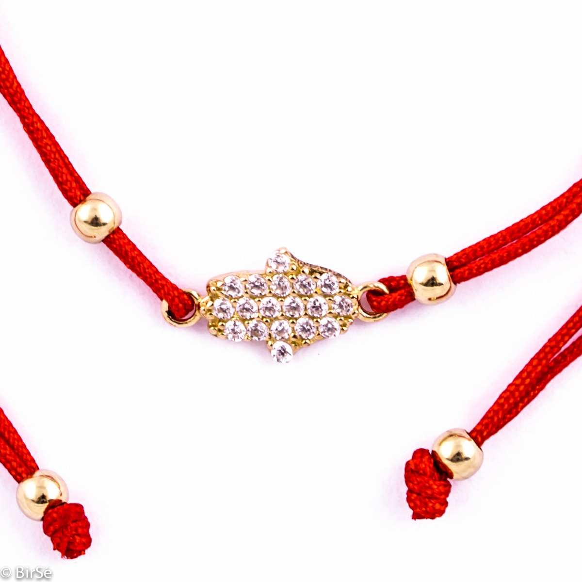 Нежна гривна от червен конец със златен талисман хамса – ръката на Фатима с бляскави циркони.