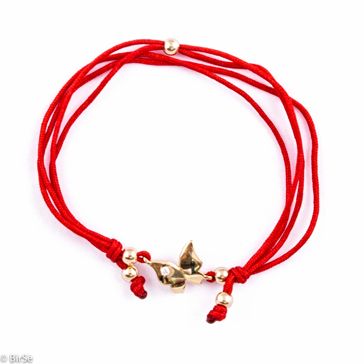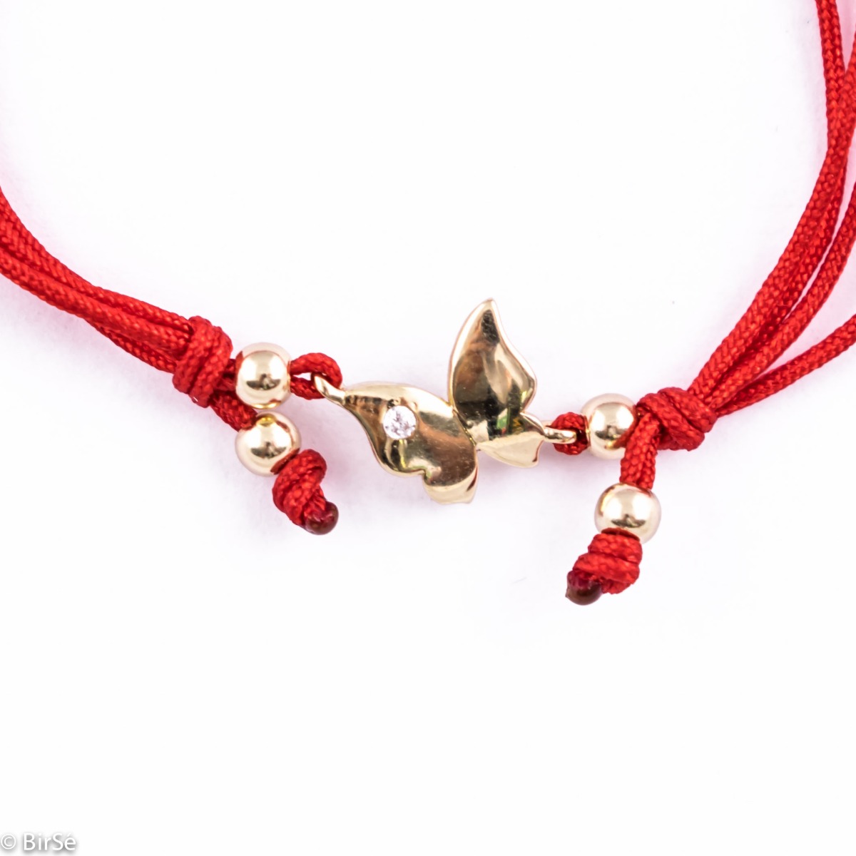 Златна гривна с червен конец „Пеперуда“ – Гривна от червен конец и нежно жълто злато. В сърцевината ѝ лежи красива пеперудка, покрита с блестящи миниатюрни циркони.