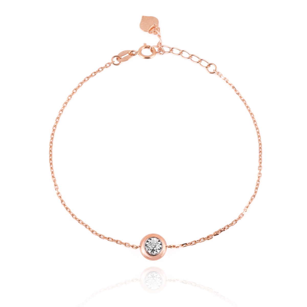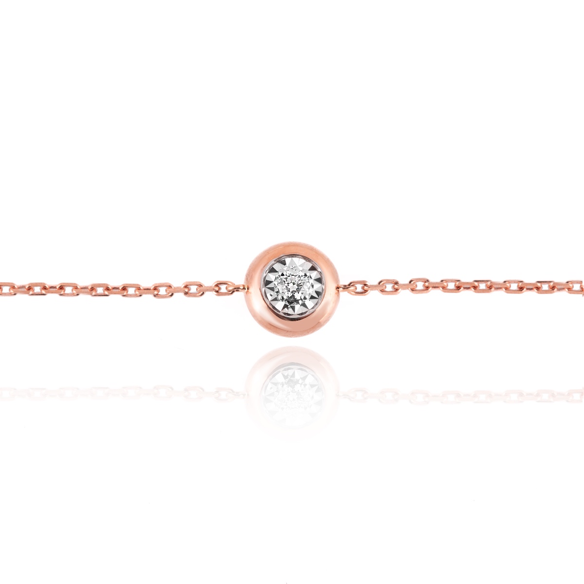 Изключително изящна дамска гривна, изработена от прелестно розово злато. Пленителен диамант 0,07 ct. проблясква сред обков от розова нежност. С възможност да се комбинира с обеци или колие с диаманти от фино розово злато.