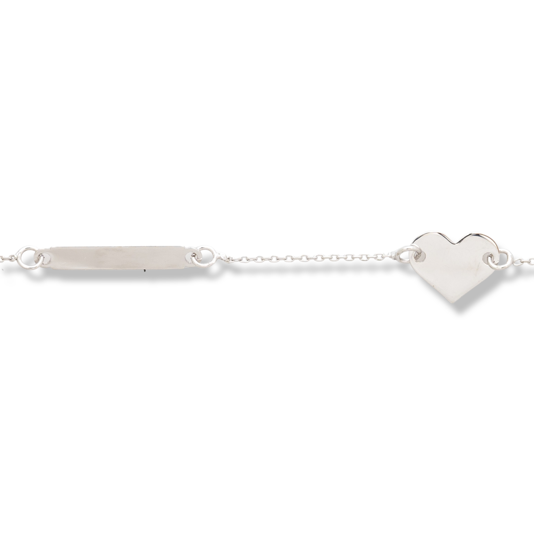 Елегантна изработка на дамска гривна изцяло от бяло злато. Гривната е с нежна верижка класическа плетка, с добавени два елемента. Единия е с форма на сърце, а другия е правоъгълна плочка. Има допълнителни халки за регулиране на дължината. Позволява гравиране на дата, инициал или име.