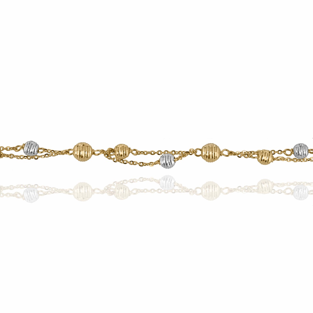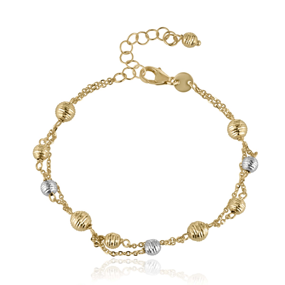 Изключително ефектна златна дамска гривна с иновативен дизайн. Върху двуредова верижка от класическо жълто злато, са монтирани диамантирани топчета в очарователна комбинация от жълто и бяло злато. Гривната е с удължение за регулиране на дължината.