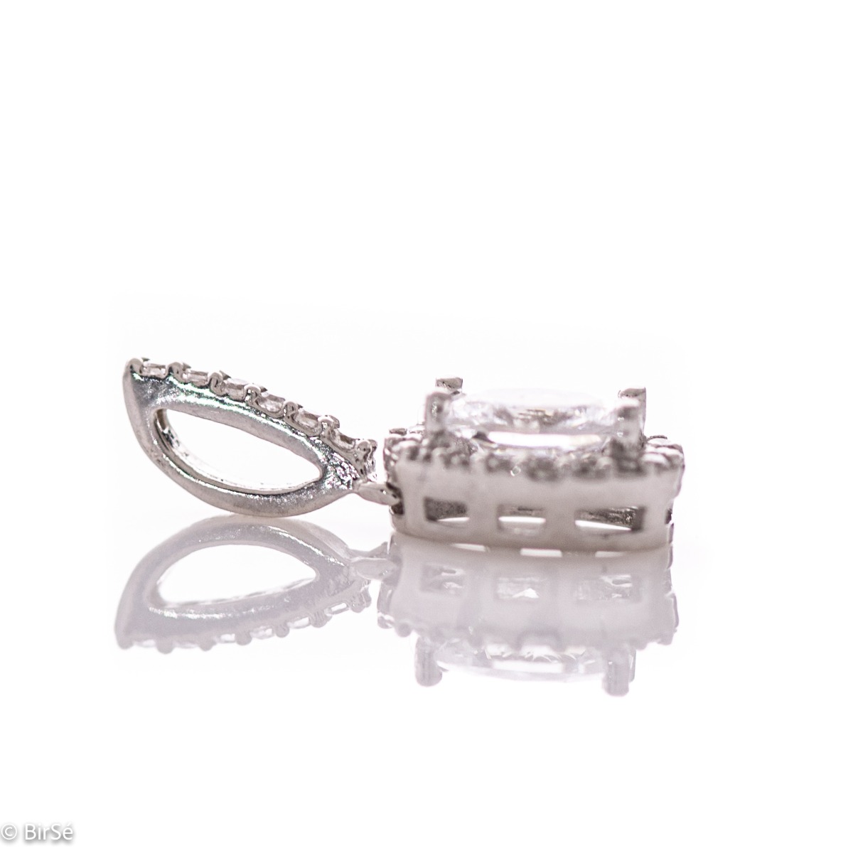 Изящна изработка на изискана висулка от бяло злато и ослепителен планински кристал. Част от прелестен комплект с пръстен и обеци с английско закопчаване - идеалния подарък за любимата жена.