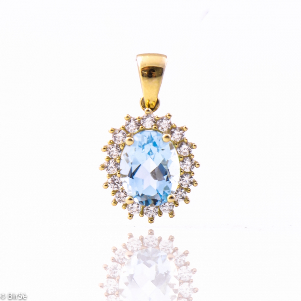 Невероятен златен медальон с класически кралски мотиви на оформлението. Стилна изработка от фино съчетание на стандартно жълто злато със син Топаз и искрящи циркони. Подходящ е за комбиниране в комплект със златен пръстен и златни обици от същата колекция.