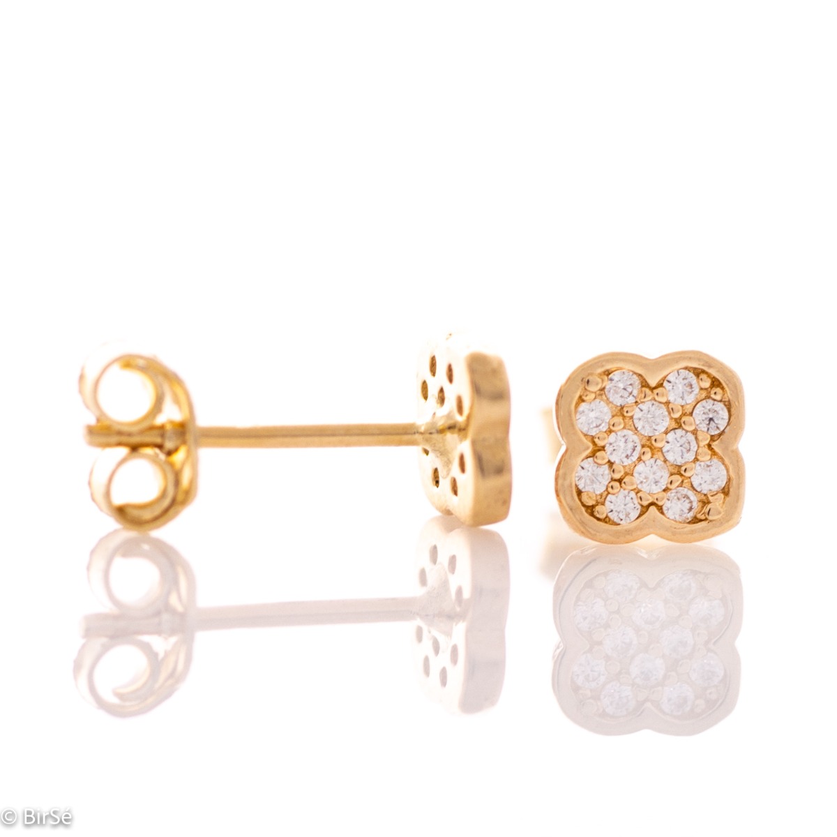 Нежно-елегантни златни обици с форма на детелинка. Стилна изработка от фино съчетание на класическо жълто злато с блестящи циркони.