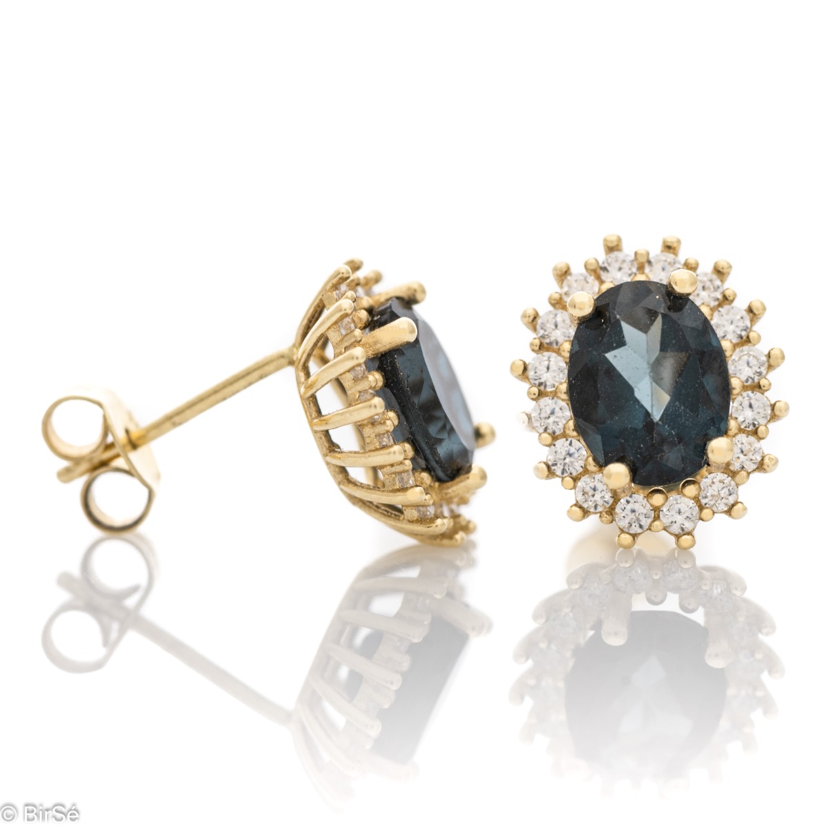Изумителни златни обици с форма Маркиза и с щифт закопчаване. Стилна композиционна изработка от нежно комбиниране на класическо жълто злато с изтънчен Лондон топаз. Фини циркони елегантно допълват обеците. Всички бижута с естествени камъни са придружени от специален сертификат, удостоверяващ автентичността им. На този сертификат можем да изпишем и лично послание за Вас или за когото е бижуто. Вижте още информация тук.