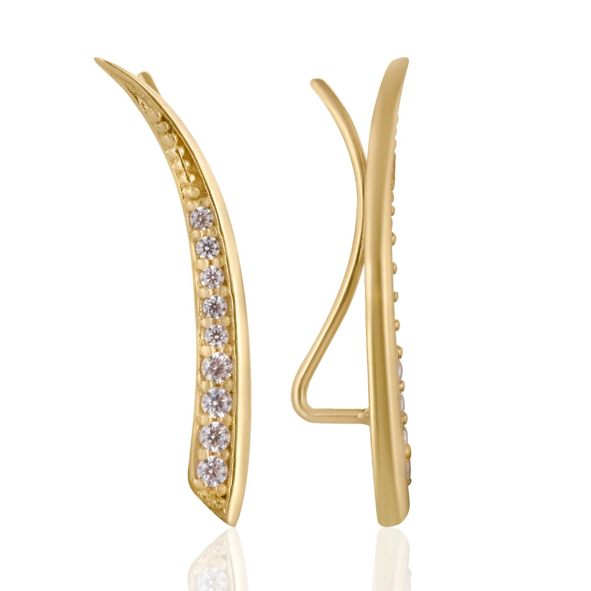 Дръзки и отличаващи се – обици от жълто злато във формата на фиби, които се промушват. Обиците са обсипани с бляскави циркони за допълнителен стилен завършек.