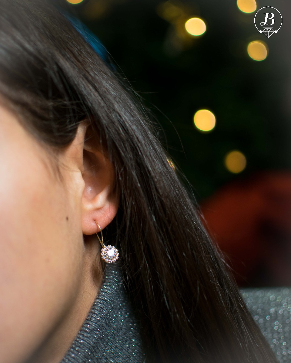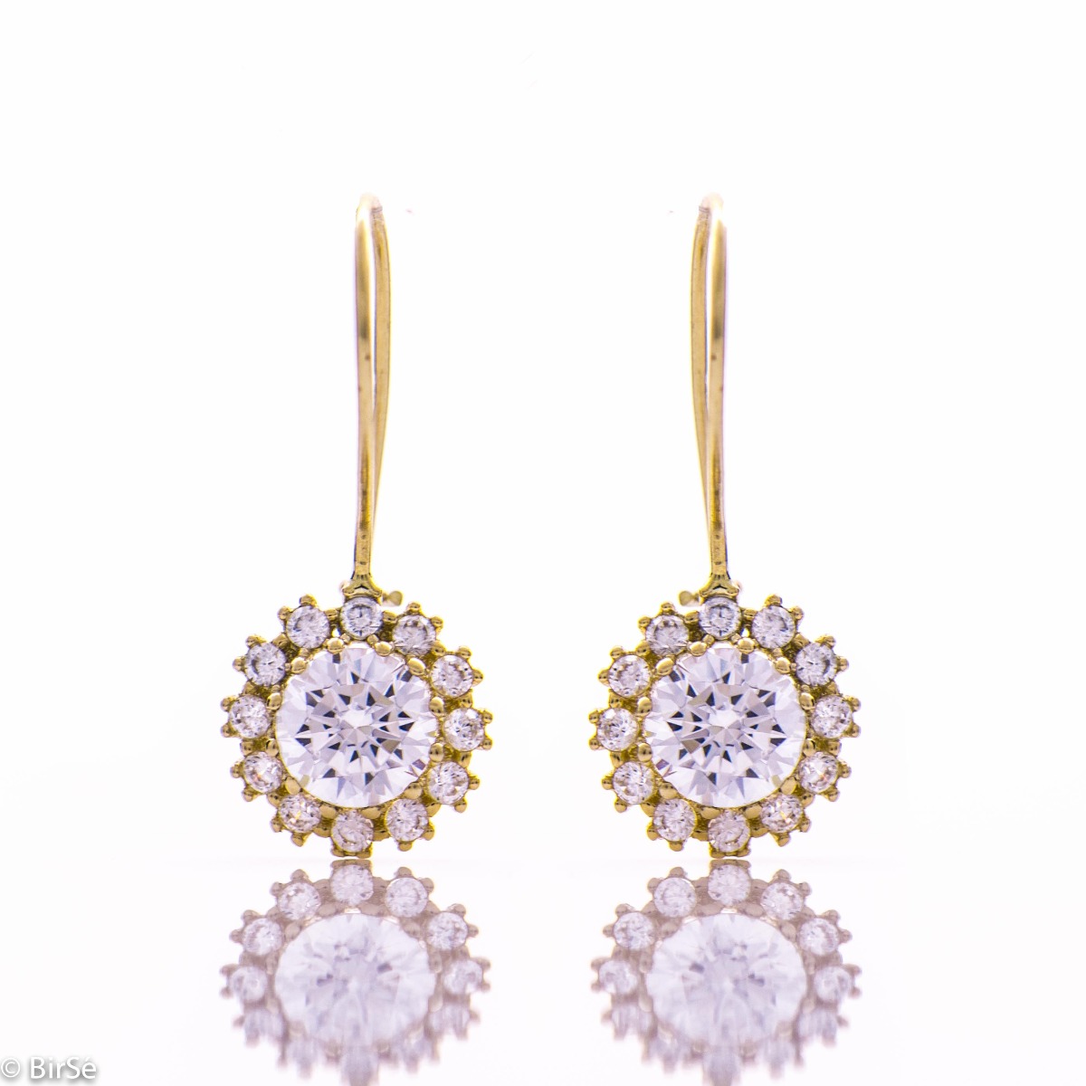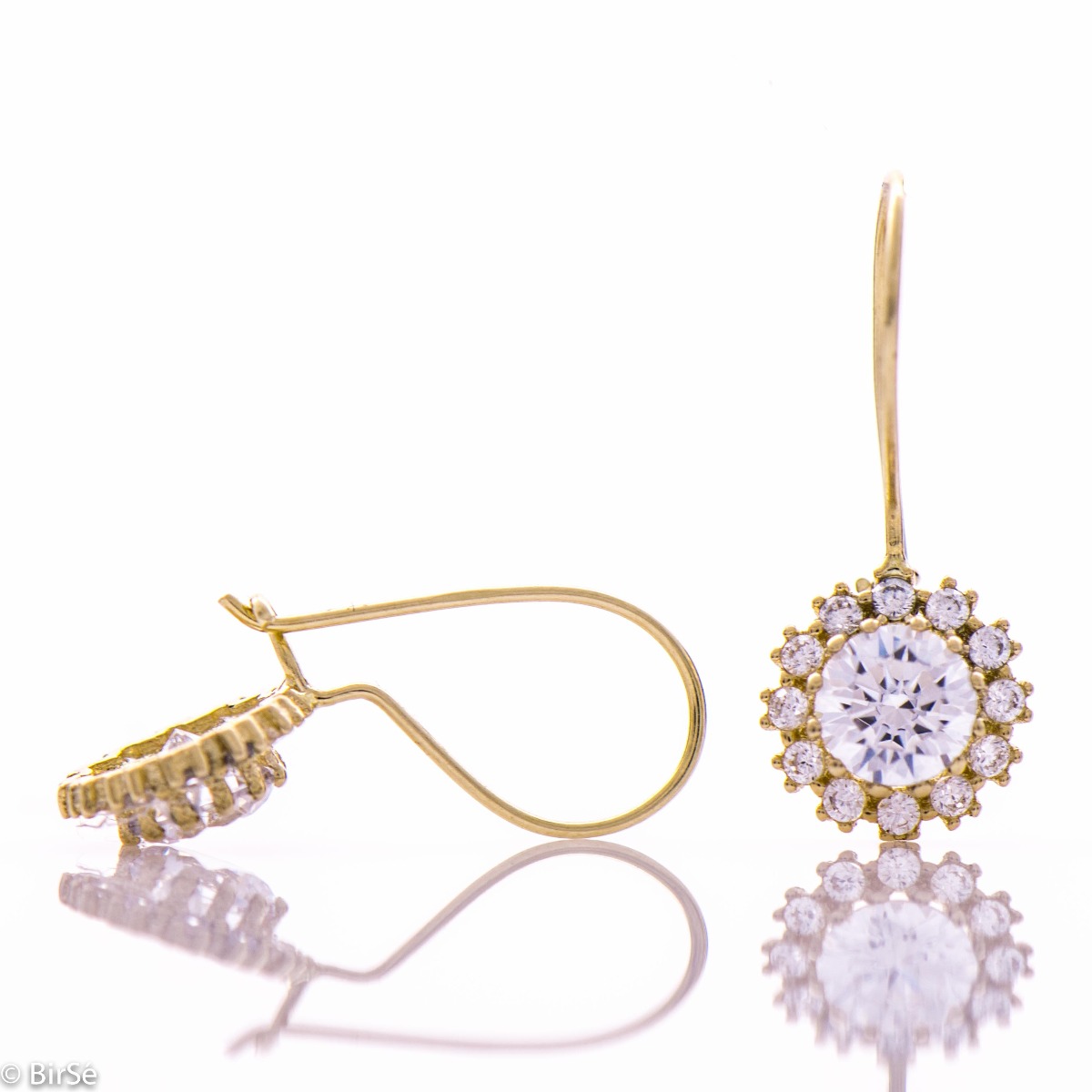 Невероятни златни обици с френско закопчаване и класически елементи на оформлението. Стилна композиционна изработка от фино съчетание на класическо жълто злато с изящни камъни циркони.