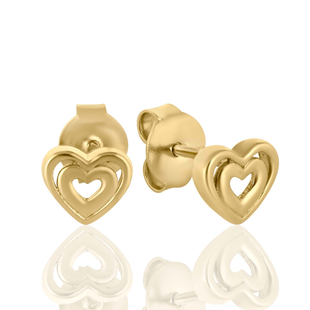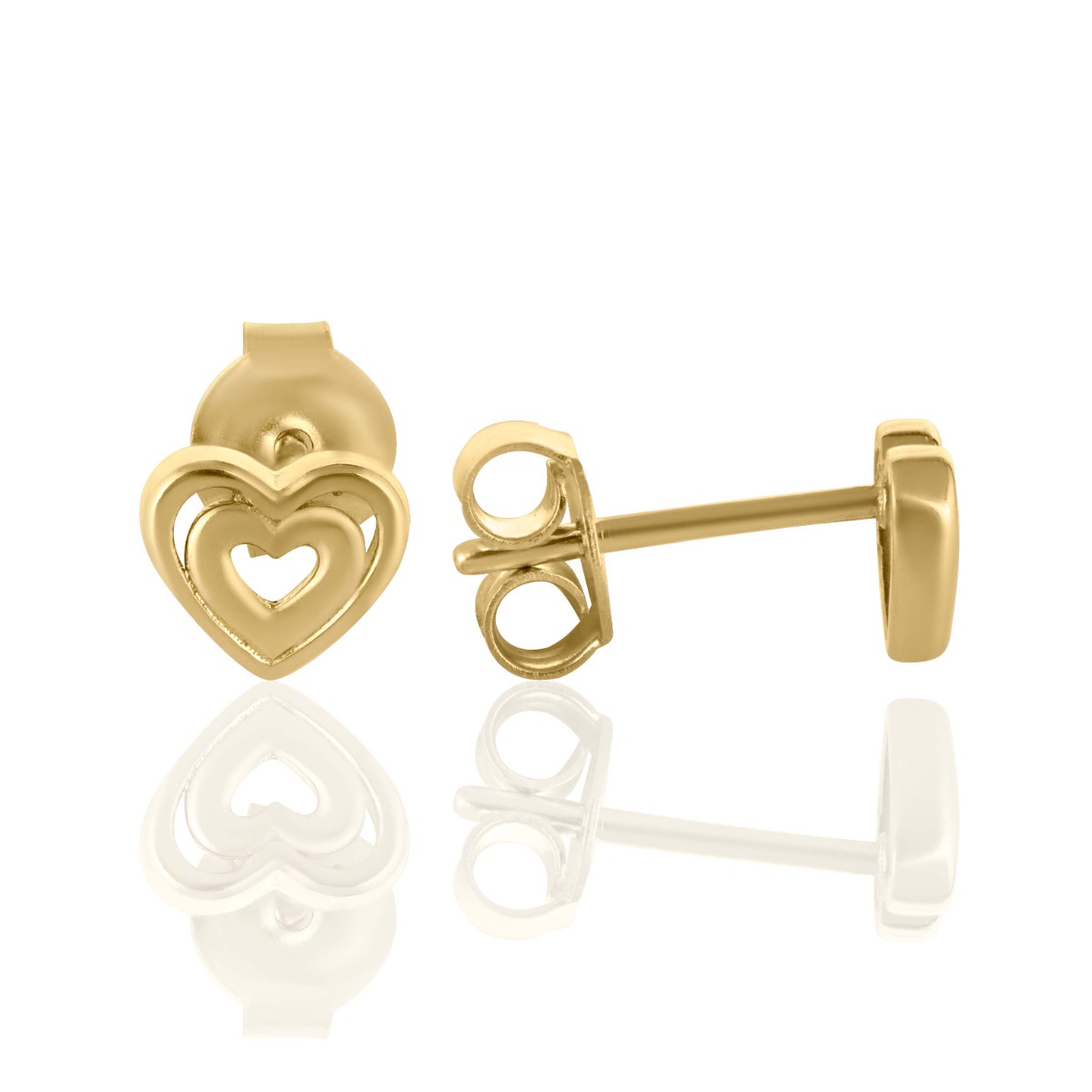 Фини златни обеци на щифт с олекотен грамаж и прецизна изработка изцяло от класическо жълто злато под формата на изящни сърчица.