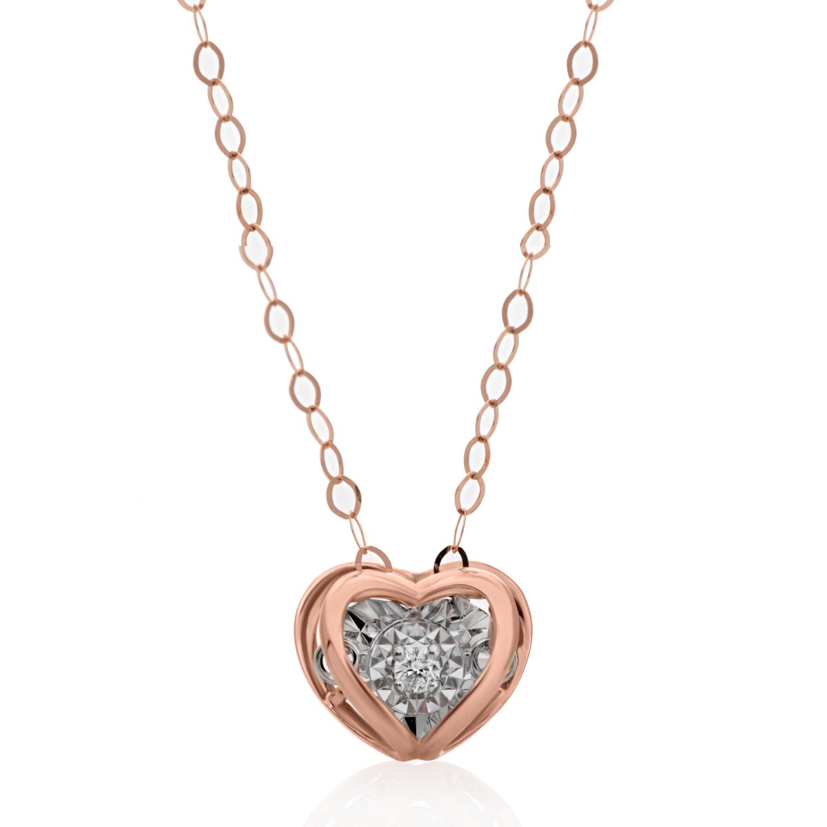 Възхитително дамско колие от розово 18к злато, с фина верижка и изящно сърчице с вълшебно пробляскващ диамант. Изненадайте любимата дама дори без повод и покажете любовта си с това прелестно колие.